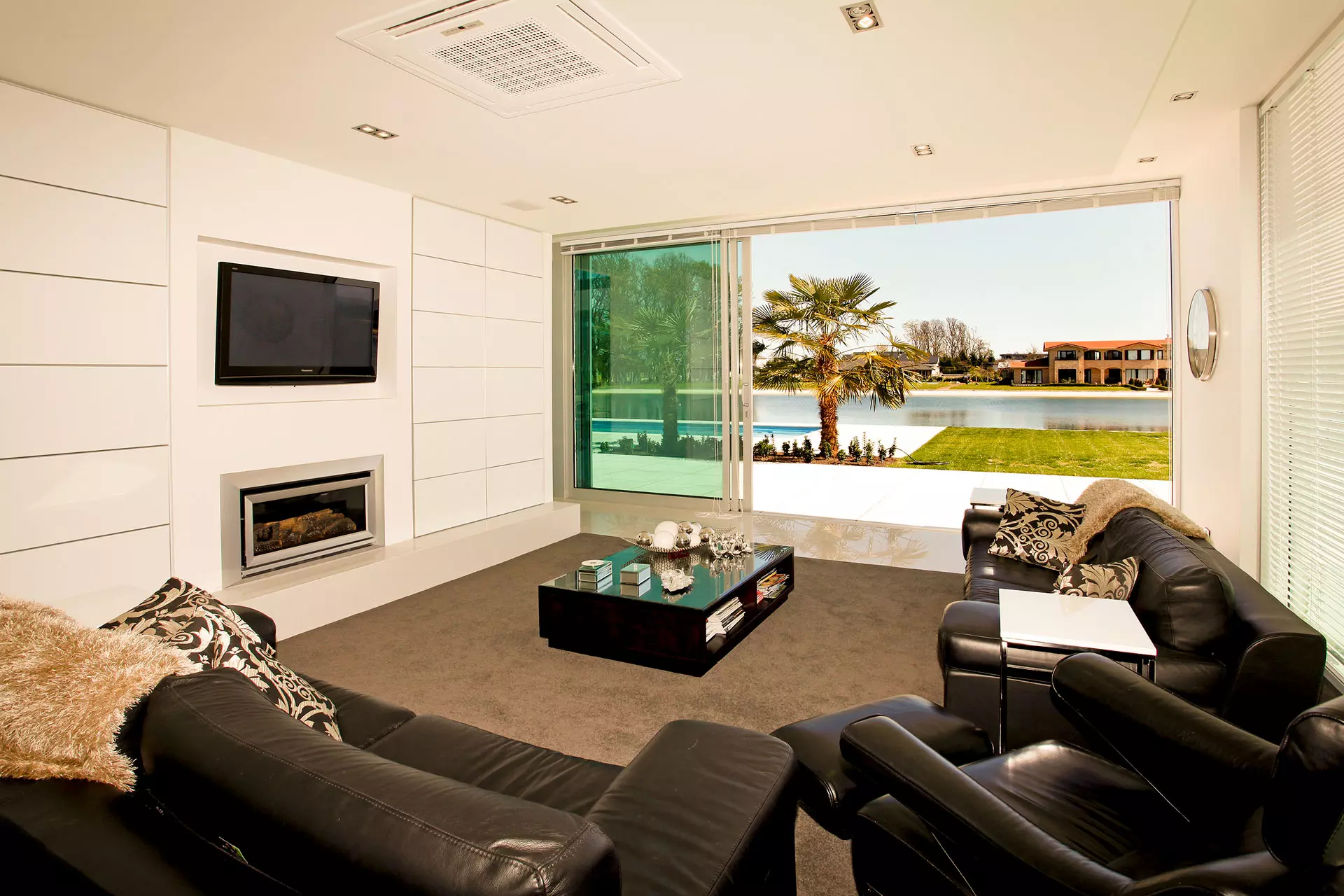 After much consideration, it was decided the most economical form of heating would be a geothermal heat pump. A DeLonghi 18.7 kW heat pump, extracting warmth from well water, was used to heat 210 square metres of ground floor space, a 500 litre hot water cylinder, and an outdoor pool. The high-end heating system perfectly complemented the home and aligned with subdivision covenants.