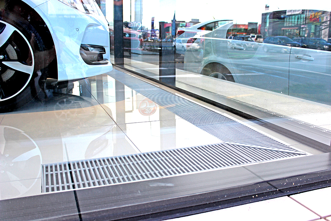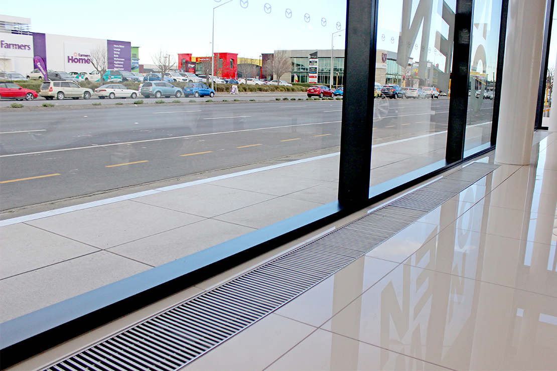 Like most showrooms, there is a large number of glazed windows and open space allowing for outside viewing. With the possibility of condensation during the cooler months, TM consultants specified a perimeter trench heater system positioned around the glazed façade from where the showroom vehicles can be seen from the street. Heat can be delivered directly to the façade preventing the formation of condensation on the windows and reducing the radiant cooling effect inside which improves the comfort and functionality of the building. 21x individual trench heater units were placed throughout the two showrooms on this site, the trench heaters were supplied with “dummy” and “corner” elements and configured in a way to allow multiple units to be combined into a seamless continuous trench with a single grille for improved aesthetics. The system in each building was powered by a large air-to-water heat pump feeding a 100L Fiorini buffer tank. From this buffer tank, the heating water was pumped to a commercial-grade FAR manifold from where each group of trench heaters is fed via insulated feeds run under the concrete floor.