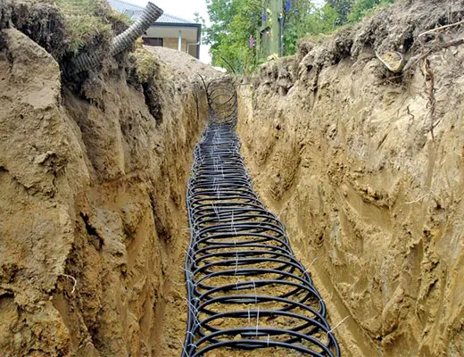 Horizontal ground exchangers are the most common for projects with plenty of space outside. Large trenches or pits are dug for pipework at approx. two metres deep. Vertical bores are used where space is more limited. Well water is another popular method used, especially in Canterbury and Southland. This can be seen in large projects in Christchurch City after the earthquakes that used aquifer water to heat and cool the buildings.