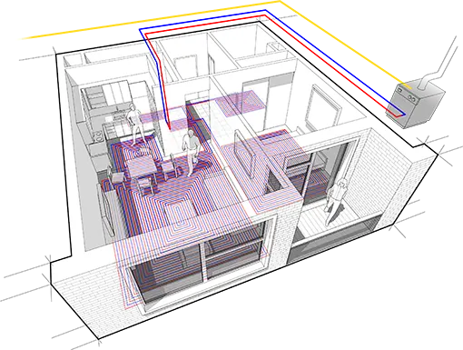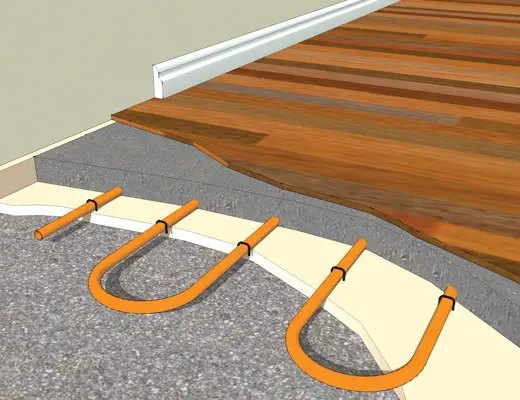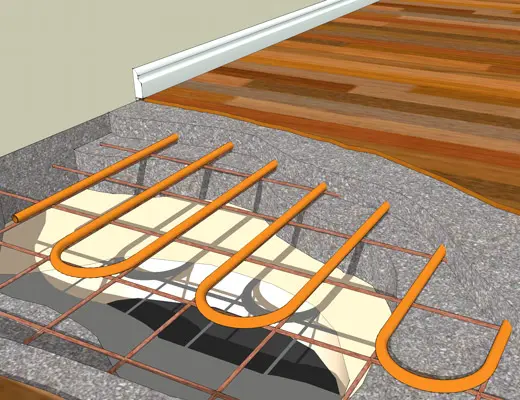 In a warm-water central heating system, pipework runs from the boiler to the underfloor throughout the house. In a wood-framed home, pipes run through the framing timber like the electrical and plumbing services to the underfloor pipes. In a house constructed of concrete, pipes can be laid in the concrete slab.