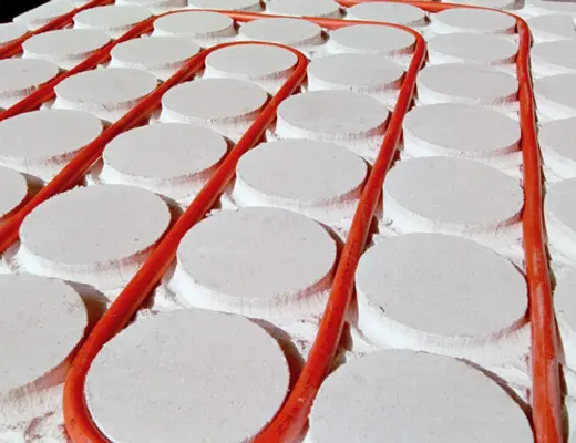 EzyMix European style screed underfloor system can be used in new or existing homes. Pipes are clipped to a high-density insulation base which sits on top of the construction slab, then a self-leveling EzyMix solution is then laid on the polystyrene covering the pipes.